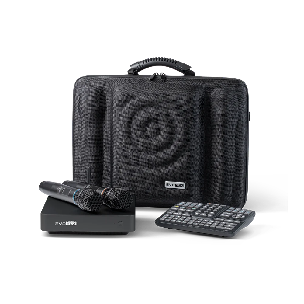 Караоке-система EVOBOX Plus поставляется в фирменном кейсе EvoCase. Это удобный кейс для транспортировки и хранения устройства. В нём надёжно и компактно размещаются все компоненты системы: караоке-система, микрофоны, пульт, кабели и другие аксессуары.