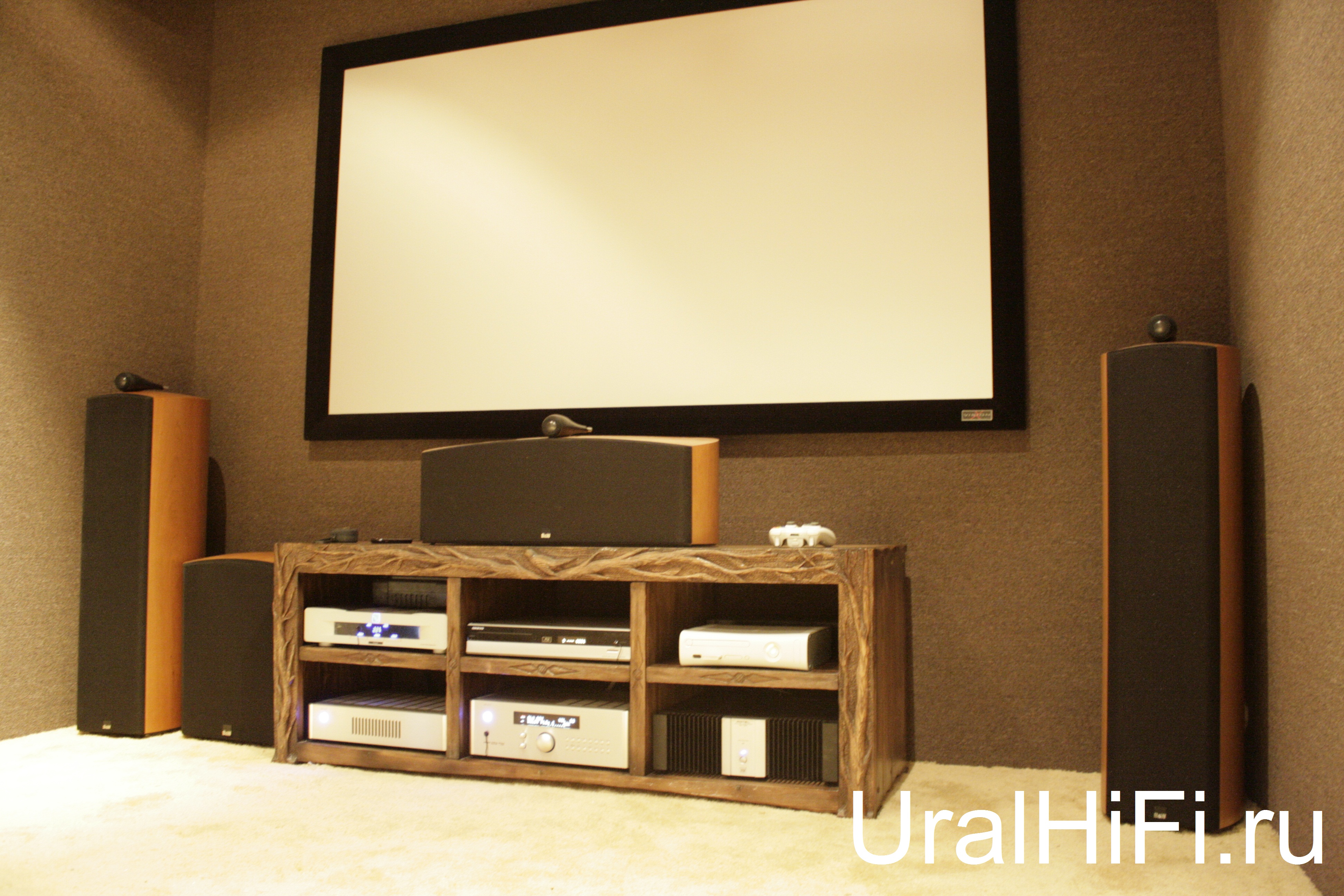 Установленная техника: Фронтальные колонки Bowers & Wilkins 803S, центр Bowers & Wilkins HTM3S, сабвуфер Bowers & Wilkins ASW825, плеер Onkyo DV-BD606, процессор Rotel RSP-1570, усилители Rotel RB-1080 и Rotel RMB-1565, экран Vutec XWF 92", регенератор напряжения PS Audio Premier.