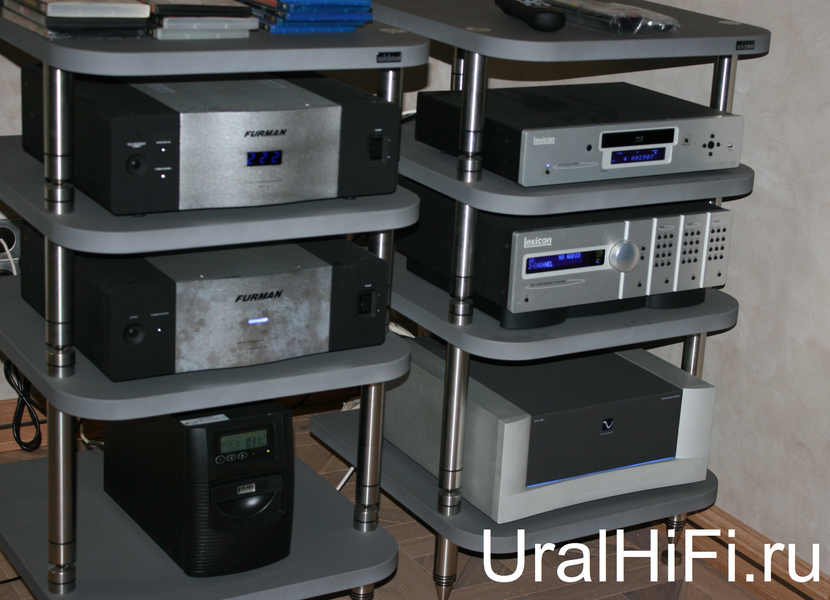 Стойка под аппаратуру Solidsteel HyperSpike HS4 (2 штуки), Blu-Ray проигрыватель Lexicon BD30, AV-процессор Lexicon MC-12B HD, усилитель мощности PS Audio GSA-MC-500-7, сетевой стабилизатор напряжения Furman SPR-16Ei, сетевой кондиционер Furman IT-Reference 16E i.