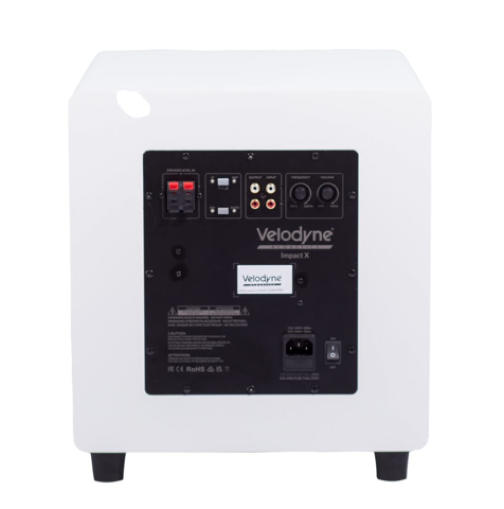 Сабвуфер оснащен фазоинвертором, выходное отверстие которого расположено на нижней панели и направлено в пол. Это делает распространение низких частот в комнате более равномерным, а также упрощает размещение сабвуфера. Большим преимуществом Velodyne Impact X 10" является наличие дистанционного управления. С помощью него пользователь может настроить звучание сабвуфера непосредственно с того места, где будет происходить прослушивание. Для подключения к аудиосистеме можно использовать линейные стерео, LFE или акустические входы.