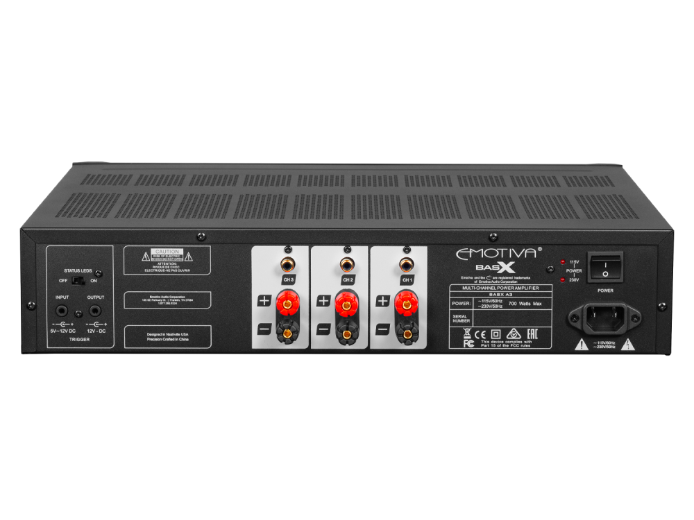 BasX A3 представляет собой трехканальный усилитель мощности 140 Вт/канал на 8 Ом и 200 Вт/канал на 4 Ом (нагружены все каналы) с номинальным значением КНИ+Ш < 0,02% и отношением сигнал/шум 112 дБ по шкале А. Он имеет массивный встроенный источник питания, высококачественную схему усиления класса A/B, защиту от сбоев, не оказывающую влияние на сигнал, а также триггерные вход и выход. Высококачественные несимметричные входы с разъемами RCA промышленного стандарта позволяют использовать BasX A3 практически с любым предусилителем или процессором, а акустические клеммы аудиофильского уровня с пятивариантным подключением предусматривают использование штекеров типа «банан», коннекторов типа «лопатка» или просто оголенных проводов. В совокупности эти особенности обеспечивают отличные характеристики и по-настоящему высокое качество звука BasX A3 при его на удивление доступной цене.