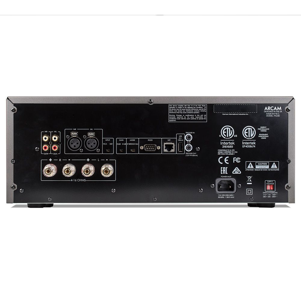 Усилитель получил новый промышленный дизайн. Корпус отличается превосходным демпфированием, а полный вес достигает 18 кг. Модель оснащается балансным входом XLR и несимметричным входом RCA, который дублируется аналогичным RCA-выходом. На тыльной панели находится ползунковый переключатель-селектор, позволяющий выбрать требуемую пару разъемов (RCA или XLR), а также переключатели для выбора одного из значений коэффициента усиления (25 дБ или 31 дБ) и для активации одного из режимов работы: стерео, мостовой режим или «двойное моно». В данном случае режим «двойного моно» позволяет использовать по одному мощнику Arcam PA240 на каждый из двух каналов. Имеется интерфейс RS-232 и LAN-порт, которые служат для интеграции Arcam PA240 в домашнюю автоматизированную систему управления или в локальную сеть для дистанционного управления и мониторинга. Модель также обладает двумя триггерными разъемами (вход и выход) и USB-портом, предназначенным для обновления ПО и зарядки аккумуляторов USB-устройств. Для подключения акустических систем служат две пары качественных винтовых клемм.