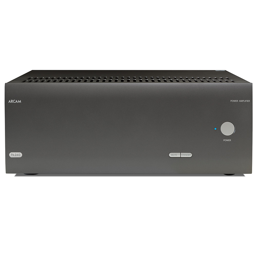 В цепях Arcam PA240 используются прошедшие тщательный отбор высококлассные комплектующие, а в блоке питания задействован массивный тороидальный трансформатор. Модель обладает выходным каскадом на транзисторах в параллельном включении и обеспечивает ничтожно малые уровни искажений. В обычном стереорежиме оконечник способен выдать 380 Вт на канал при 4 Ом и 225 Вт при нагрузке в 8 Ом. При включении в мостовом режиме аппарат превращается в моноблок, гарантирующий внушительные 790 Вт при восьмиомной нагрузке.