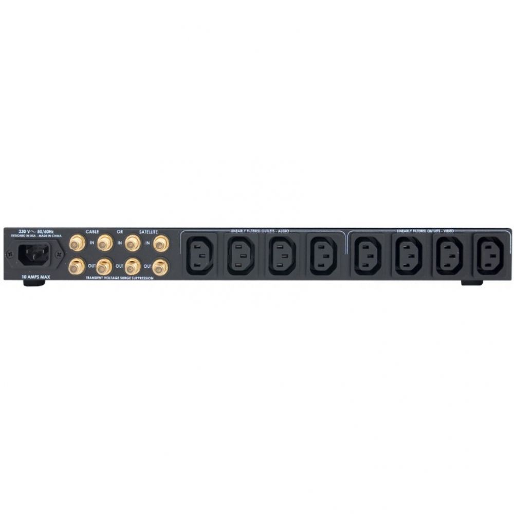 На задней панели фильтра расположено восемь сетевых розеток для подключения AV-оборудования. Четыре из них подключены к линейным фильтрам, а еще четыре имеют дополнительную ВЧ-фильтрацию. Последние предназначены для подачи напряжения на цифровые источники сигнала или видеотехнику, которые могут стать источником специфических высокочастотных помех. Также здесь имеет восемь позолоченных коаксиальных разъемов для фильтрации помех в кабельных сетях. На передней панели Furman Elite-10E i расположен цифровой индикатор сетевого напряжения лабораторного класса, а также две оригинальных выдвигающихся светодиодных лампы. Они предназначены для подсветки стойки с оборудованием в полутемном зале домашнего кинотеатра, в которую будет установлен фильтр. Яркость свечения этих ламп можно регулировать.