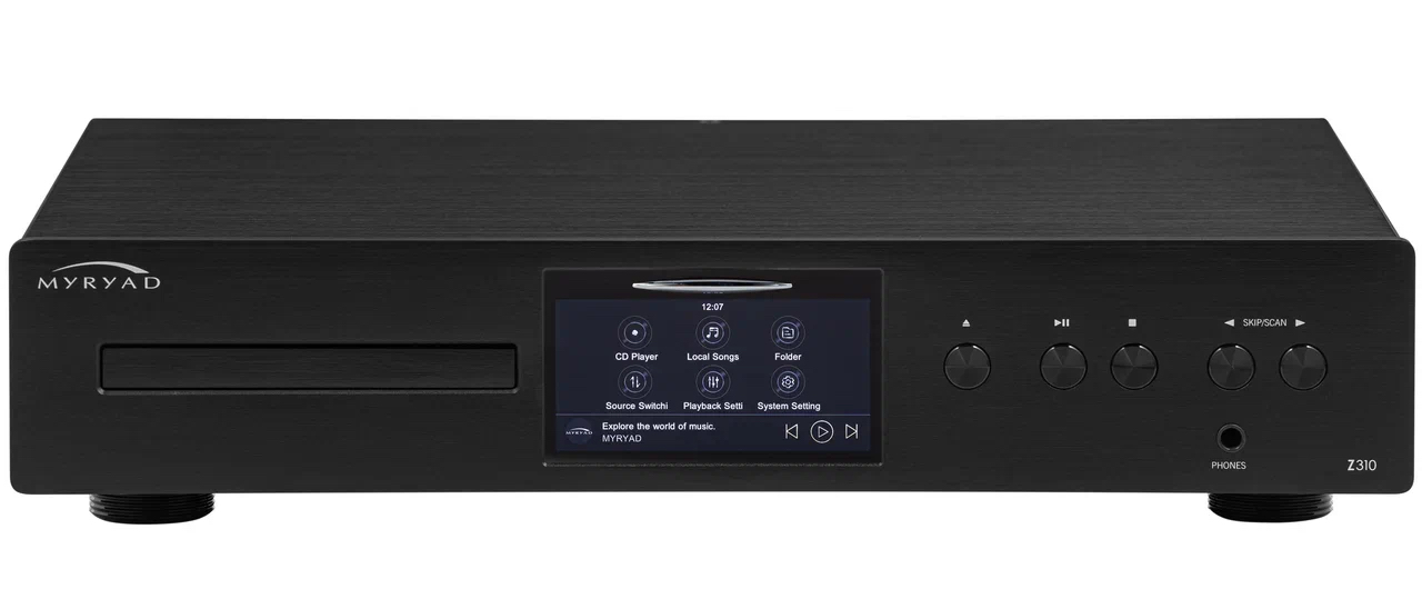 Компания Myryad выпустила современный CD плеер / цифровой медиа плеер Z310. При производстве данной модели использовались аудиофильские комплектующие: чип ЦАП — ESS ES9219C, чипы Bluetooth 5.0, конденсаторы NICHICON, аудиотранзисторы Sanken. Плеер имеет высококачественный аналоговый XLR выход и классический RCA. Так же Z310 обеспечен всеми необходимыми цифровыми выходами – оптическим и коаксиальным, а для желающих воспроизводить свой контент через USB – можно использовать встроенный ЦАП с замечательными характеристиками 32бит/768кГц и DSD512 – USB type B или USB type A – для подключения флеш – накопителя. На борту проигрывателя имеется современный Bluetooth 5.0 для передачи HiRes Audio без потерь. Плеер оборудован большим цветным сенсорным экраном. Для владельцев наушников в Z310 имеется выход 6,35 мм.