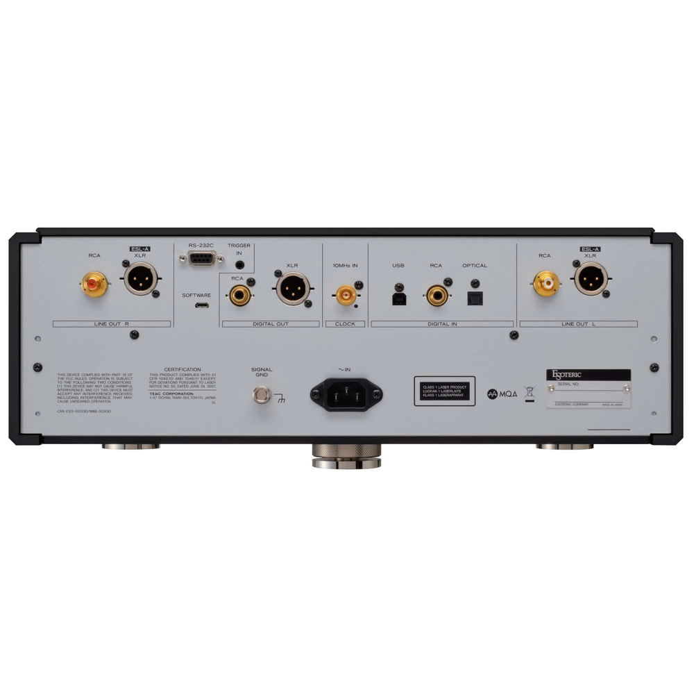 Esoteric K-05XD оснащен декодером MQA. Есть порт RS-232C для управления включением/выключением триггера. Пульт дистанционного управления RC-1333, который также может управлять усилителями Esoteric.