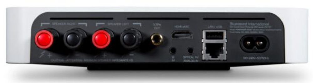В верхнюю часть компактного корпуса BlueSound PowerNode Edge N230 интегрирована сенсорная панель управления. На задней стенке имеется разъем 3,5 мм, сочетающий в себе линейный AUX и оптический вход. Там же находится RCA-порт для сабвуфера, USB для внешних накопителей, LAN-порт для интеграции в локальную сеть и разъем HDMI с поддержкой расширенного возвратного канала eARC, позволяющий подключить проигрыватель к ТВ.