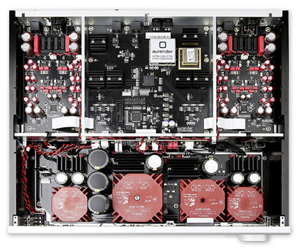 - ЦАПы 2 х AKM AK4497 (32 бит/768 кГц) в конфигурации «двойное моно» (по одному чипу на канал, раздельное питание для каждого чипа от отдельных трансформаторов линейного БП)