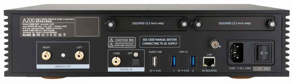 Aurender A200 оснащен двумя разъемами USB для подключения внешних накопителей, а для соединения с сетью используется гигабитный Ethernet с двойной защитой от помех. Предусмотрена поддержка сервисов TIDAL, Qobuz, Spotify, а также воспроизведение музыкальных файлов всех популярных форматов с сетевых устройств. Аппарат оснащен линейным блоком питания на трех тороидальных трансформаторах, для полного разделения функциональных узлов и исключения перекрестных помех. Предусмотрен встроенный источник бесперебойного питания на базе «суперконденсатора». Aurender A200 имеет высококлассную аналоговую схему c возможностью получения фиксированного или регулируемого сигнала на выходе. При желании плеер можно подключить к внешнему USB-ЦАП, также аппарат оснащен коаксиальным и оптическим входами для подключения внешних цифровых источников.