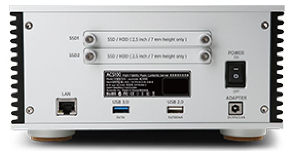 На тыльной панели компактного алюминиевого корпуса Aurender ACS100 4Tb имеются два «кармана», в каждый из которых можно установить SSD или 2.5-дюймовый HDD высотой не более 7 мм, предназначенные для хранения аудиофайлов. В данном случае в каждом из «карманов» находится по одному 2-терабайтному HDD. В фасад встроен 4-дюймовый LCD-дисплей с IPS-матрицей, над которым находится щелевой слот CD-риппера. Для получения файловой копии компакт-диска в форматах FLAC, WAV или AIFF (на выбор) используется высокоточный CD-ROM TEAC с высокоэффективной системой обнаружения ошибок. Процедура полностью автоматическая: для запуска процесса достаточно вставить CD в слот и нажать на кнопку. Полученные файлы сохранятся в указанной пользователем папке. При этом система добавляет метаданные, которые вместе с обложками альбомов можно просматривать на дисплее.