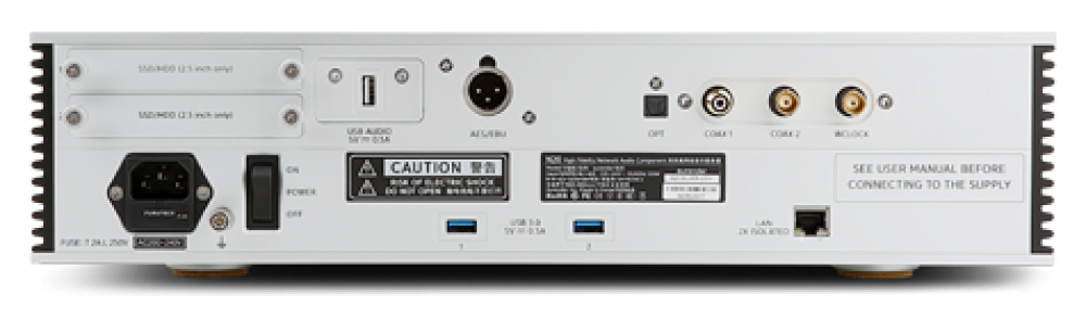 На тыльной панели имеется набор цифровых выходов: S/PDIF-разъемы с трансформаторной развязкой от «земли» (коаксиальные RCA/BNC и оптический), балансный AES/EBU и экранированный USB-выход, поддерживающий PCM до 32 бит/384 кГц, DSD до DSD256 (DoP) и нативный DSD до DSD512. В качестве опции заявлена поддержка MQA. Для внешних накопителей имеются два отдельных USB, а для доступна к локальной сети и NAS-серверам служит LAN-интерфейс с двойной изоляцией от помех. Присутствует вход для внешнего синхронизирующего клока, уменьшающего джиттер и улучшающего звучание при использовании S/PDIF-выходов. Модель собрана в алюминиевом корпусе с 8,8-дюймовым цветным дисплеем.