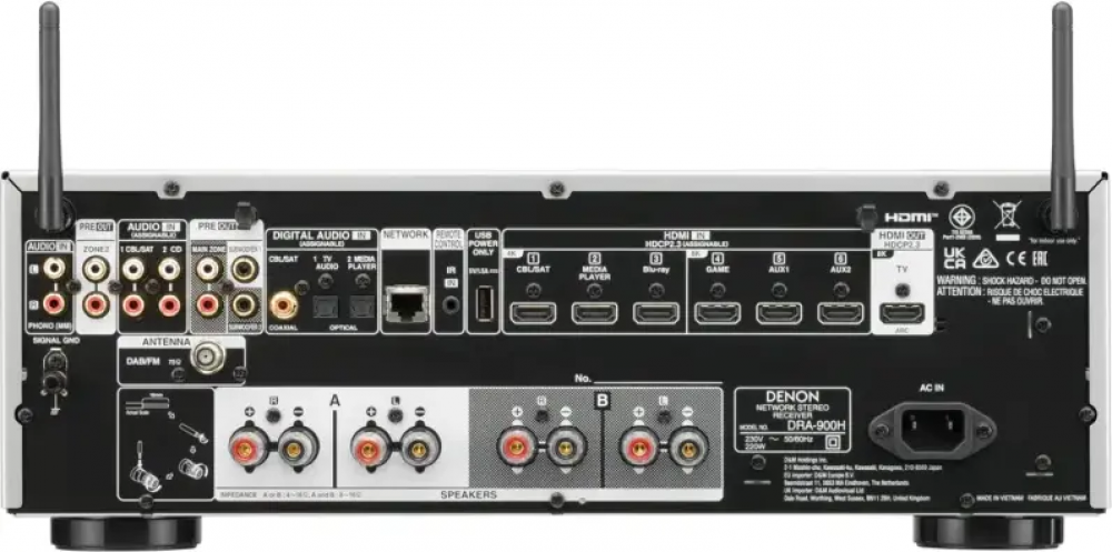 Стереоресивер развивает номинальную выходную мощность 100 Вт на канал при работе на 8-омную акустику. Так как нагрузка на блок питания в Denon DRA-900H ниже, чем в многоканальных ресиверах, при сравнимых габаритах и весе аппарат обладает более динамичным и насыщенным звуком. В то же время его легко интегрировать в AV-систему благодаря наличию шести HDMI-входов с поддержкой видео 8K, HDCP 2.3, Dolby Vision. Также Denon DRA-900H имеет два оптических и цифровой входы, три линейных и вход встроенного фонокорректора для MM-звукоснимателей. К устройству можно подключить две пары АС, например, при желании озвучить дополнительное помещение. Если потребуется получить более глубокие басы, пригодятся выходы для подключения активных сабвуферов.