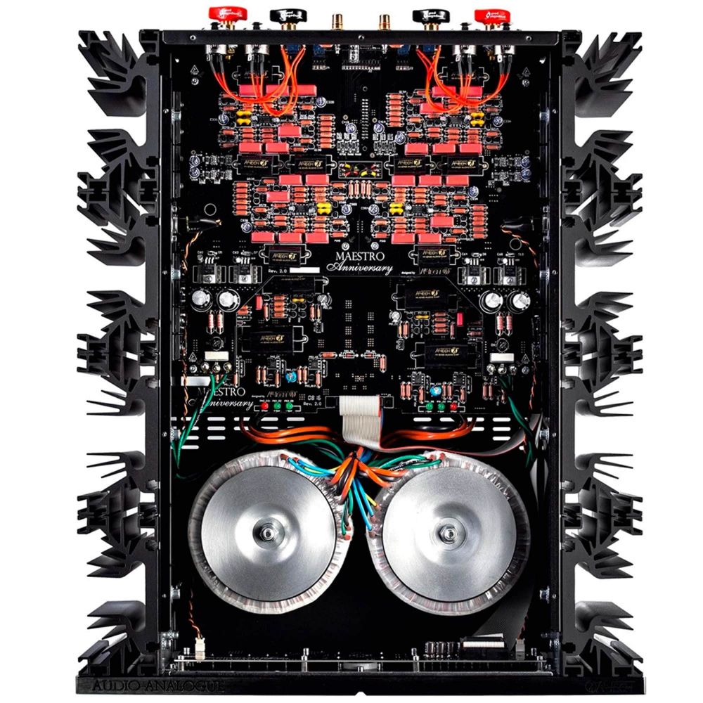 Maestro 2.0 - это интегральный усилитель с балансной схемой и нулевой обратной связью. Конфигурация полностью 'dual mono', начиная с двух тороидальных трансформаторов мощностью 670 Вт. Каждый каскад усилителя имеет специальную конструкцию, состоящую в общей сложности из шести различных плат, соединенных медными проводниками 7N OCC, которые используются для изготовления высококачественных кабелей Airtech.