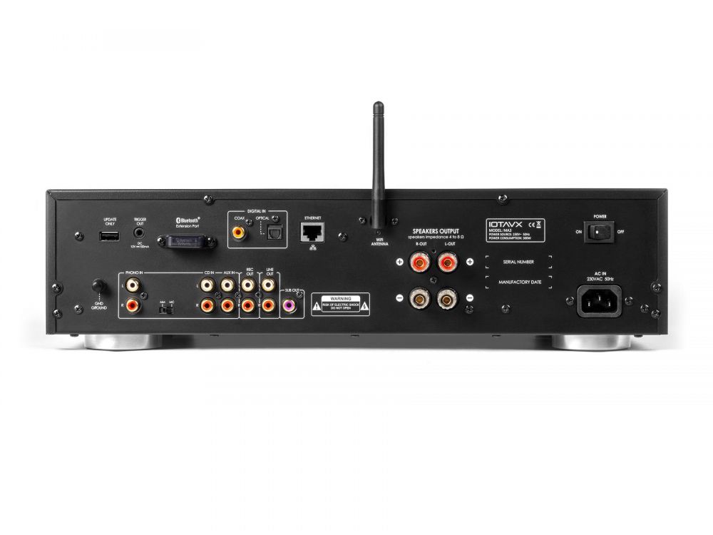 На задней панели IOTAVX МА-3 располагаются: входные разъёмы RCA (аналоговые стереовходы линейного уровня - CD и Aux), RCA вход фонокорректора MM/MC, цифровые входы: коаксиальный S/PDIF и оптический TosLink, разъём LAN (RJ45) для подключения Ethernet. Там же находятся 3 выхода RCA (аналоговый стереовыход линейного уровня, аналоговый стереовыход предусилителя и выход на сабвуфер) и триггерный выход 12 В ( mini jack 3,5).