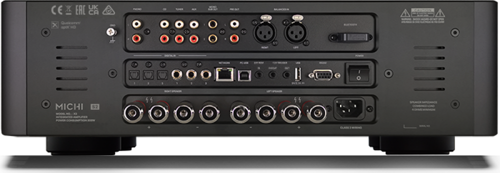 Элегантный индустриальный дизайн Michi X3 Series 2 удобно впишется в любое жилое пространство, сохраняя при этом выходную мощность 350 Вт (на 4 Ом) от ваших любимых источников, включая аналоговые на RCA, балансные на XLR, беспроводный Bluetooth с aptXTM HD, цифровые коаксиальные и оптические. Вход PC-USB поддерживает PCM (32-бит/384 кГц), DSD 4x (11.2MHz) и аппаратно декодирует MQA до 24-бит/384 кГц. Любители классического винила оценят вход фонокорректора для картриджей с подвижным магнитом (ММ).