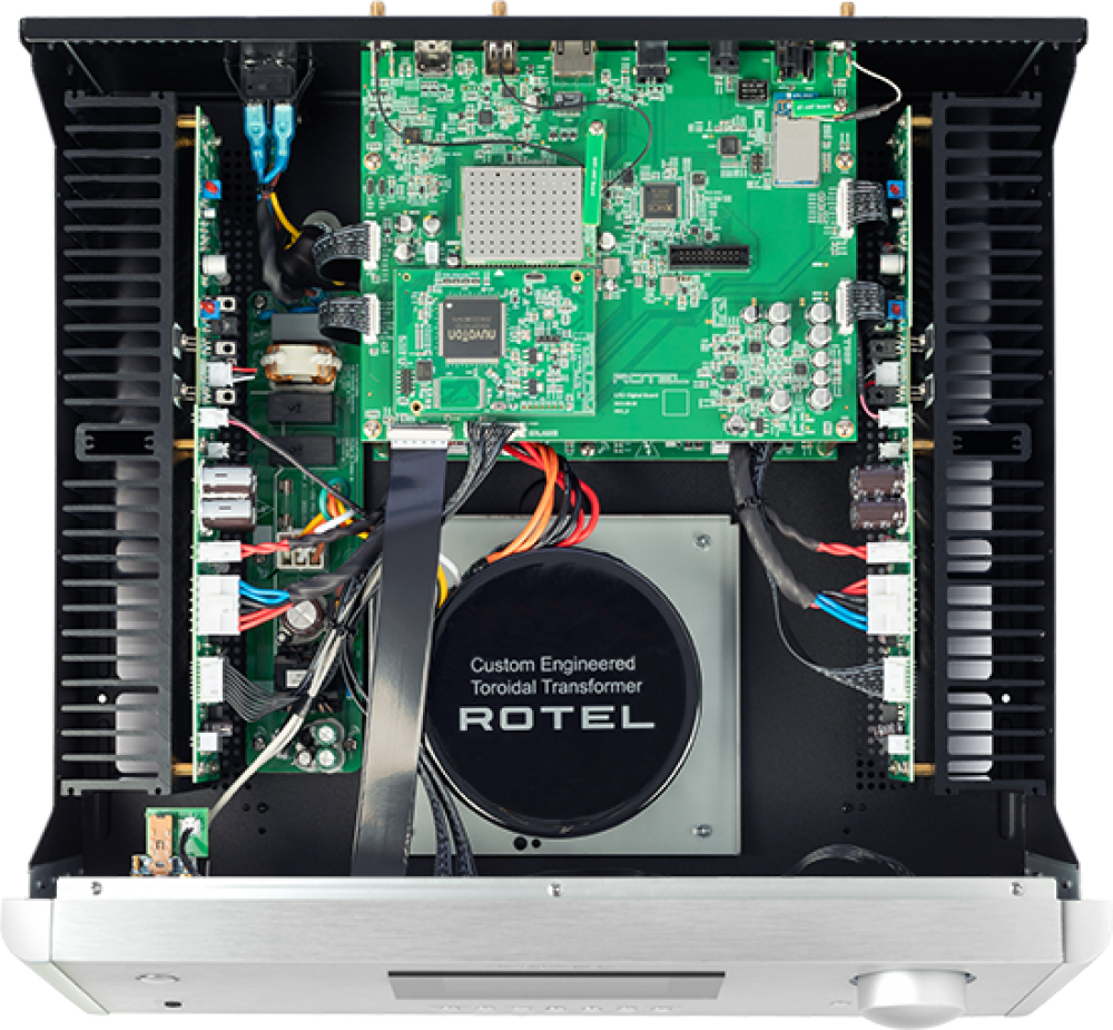 Как и все усилители Rotel, RAS-5000 построен на базе мощного линейного источника питания с тороидальным трансформатором собственного производства, который позволяет выдавать ошеломляющие 220 Вт мощности в классе AB на 4 Ом. Усовершенствованный источник питания обеспечивает сверхнизкий уровень шума для всех критически важных компонентов и большие токи для выходных транзисторов усилителя, что позволяет выдавать глубокие и контролируемые басы с исключительной точностью воспроизведения.