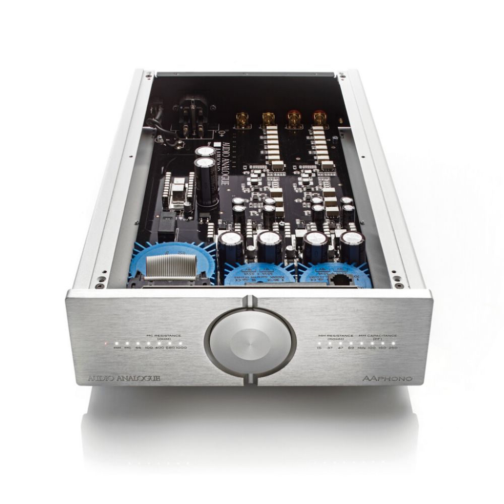 AAphono был разработан с использованием конфигурации двойного операционного усилителя, которая позволяет распределять общее усиление между двумя усилителями, что дает более точную характеристику АЧХ. Были предприняты большие усилия, чтобы получить хороший результат по этому параметру, используя высококачественные компоненты с низким допуском, используемые в параллельной конфигурации с целью устранения ошибок. Чтобы устранить возможные колебания LP, между первым и вторым усилителями был добавлен дозвуковой фильтр, чтобы избежать насыщения каскадов усиления сильными низкочастотными колебаниями. Схема была дополнена несколькими фильтрами в секции источника питания. Присутствуют три тороидальных трансформатора — для питания платы управления, а также левой и правой аналоговых секций, что обеспечивает разделение заземления. Все пассивные компоненты были тщательно отобраны. Конденсаторы, используемые для выравнивания кривой АЧХ, изготовлены с низким допуском. AAphono очень универсален и прост в использовании. Для картриджей MM можно установить входную емкость и сопротивление, а для картриджей MC можно установить входное сопротивление, просто нажав соответствующие кнопки, расположенные под лицевой панелью. Выбранная конфигурация и настройки остаются неизменными при выключении фонокорректора или