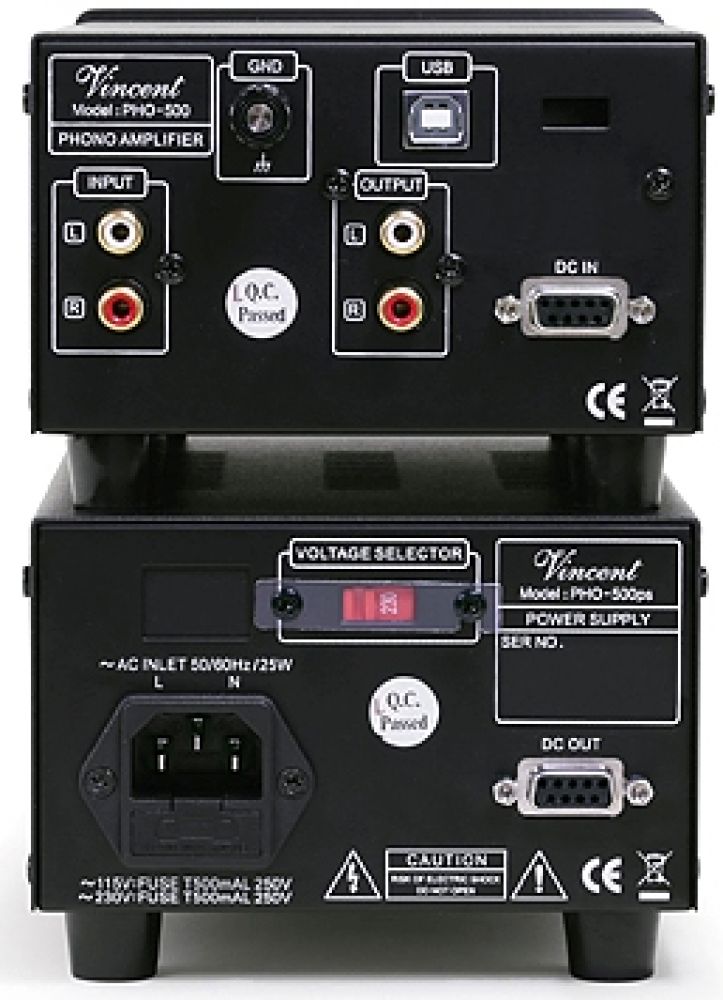 Фонокорректор Vincent PHO-500 спроектирован с целью «применить RIAA-коррекцию к записи и передать сигнал на систему с минимальными искажениями». Основной «предпосылкой» для малошумящей работы устройства стал блок питания. У Vincent PHO-500 источник питания вынесен в отдельный корпус, чтобы электромагнитные поля не могли влиять на фонокорректор. По словам производителя, в новой модели стоят исключительно высококачественные компоненты от известных производителей (например, WIMA и Nichicon). Входная емкость и входное сопротивление могут быть отрегулированы — это обеспечивает оптимальное согласование практически с любым звукоснимателем (MM или MC). Характерная особенность PHO-500 — выход USB, который функционирует как аналогово-цифровой конвертер. Оцифровать пластинки можно в качестве 24 бит/192 кГц.